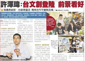 2016年8月27日,由《旺報(bào)》主辦的“2016第一屆兩岸青年創(chuàng)業(yè)論壇”在中國臺(tái)灣省新北市舉辦,91投資、91眾創(chuàng)空間、91金融董事長許澤瑋受邀出席并作主題演講。許澤瑋表示,在創(chuàng)新創(chuàng)業(yè)合作上,兩岸三地生態(tài)優(yōu)勢互補(bǔ),大陸人善于學(xué)習(xí)、有創(chuàng)新精神,而臺(tái)灣人靈活、有創(chuàng)意、懂生活。非常看好臺(tái)灣文創(chuàng)產(chǎn)業(yè)到大陸發(fā)展的前景。