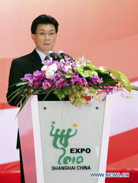 Singapore's Minister of State for Trade and Industry and Manpower Lee Yi Shyan, speaks at the ceremony celebrating the National Pavilion Day for Singapore, in the 2010 World Expo in Shanghai, east China, Aug. 7, 2010. (Xinhua/Li Baishun)