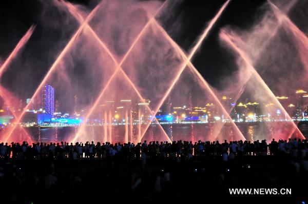 Tourists watch the music fountain in the World Expo Park during the World Expo in Shanghai, east China, Aug. 28, 2010. (Xinhua)