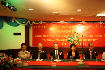 王應(yīng)邀出席洛坤府15僑團國慶聯(lián)歡晚宴。洛坤府府尹、洛坤市市長、府警廳廳長及當(dāng)?shù)?5僑團僑胞等400余人出席。副府尹在致辭中首先祝賀中華人民共和國成立61周年,并表示,新中國是年輕的,但中華大地歷史悠久,他欣賞中國古老絢麗的文化,同時感慨61年來中國的飛速發(fā)展和變遷,祝福中國日益繁榮昌盛,人民幸福安康。王在致辭中首先回顧了新中國成立以來的發(fā)展歷程,強調(diào)中國堅持走和平發(fā)展道路;王還介紹了近年來中泰關(guān)系發(fā)展情況,并希望雙方以建交35周年為起點,擴大合作,共謀發(fā)展,共同創(chuàng)造更美好的未來。