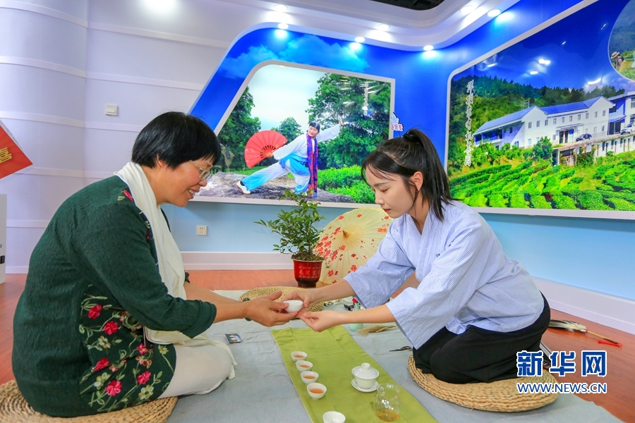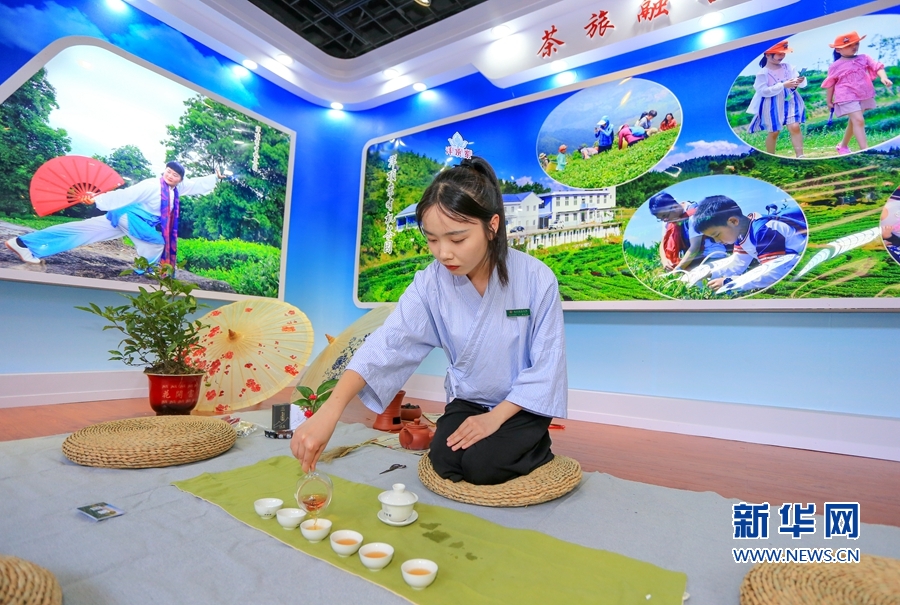 6月14日,茶文化體驗館,茶藝師在茶席上向客商奉茶。新華網 肖和勇 攝