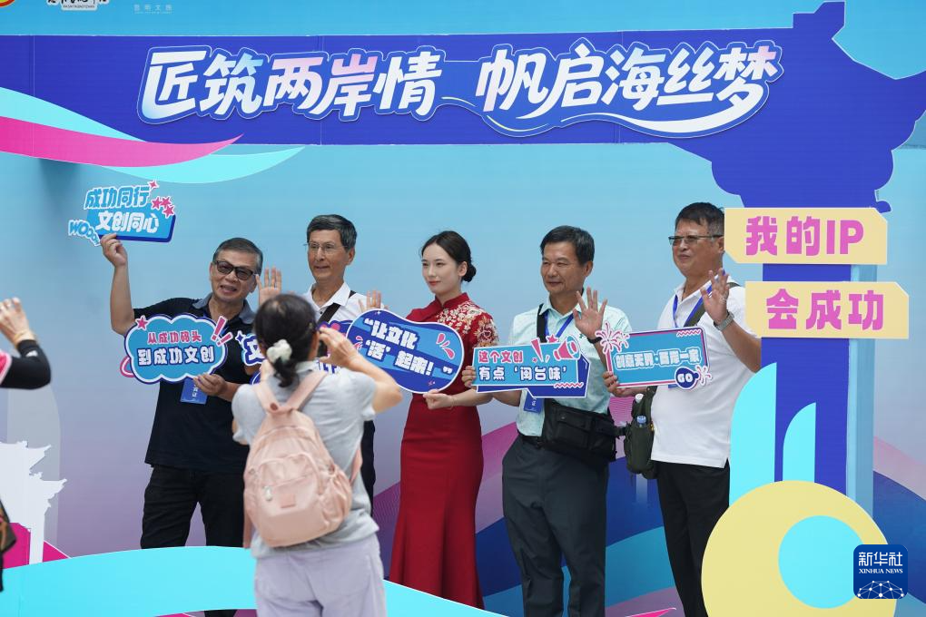 6月15日,參會人員在“匠筑兩岸情 帆啟海絲夢”的展板前合影。新華社發(王鑫攝)