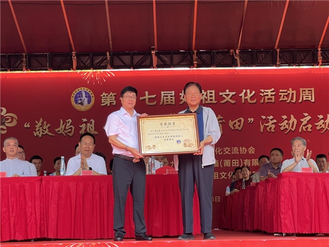 中國(guó)僑聯(lián)原主席、中華媽祖文化交流協(xié)會(huì)第一、二屆副會(huì)長(zhǎng)林兆樞宣布活動(dòng)正式啟動(dòng)。福建省第十一屆人大常委會(huì)副主任、協(xié)會(huì)名譽(yù)會(huì)長(zhǎng)袁錦貴為媽祖全球行、吉祥九寶文化傳承創(chuàng)始人陳玉彬頒發(fā)“媽祖九寶文化傳承創(chuàng)始人”榮譽(yù)證書。