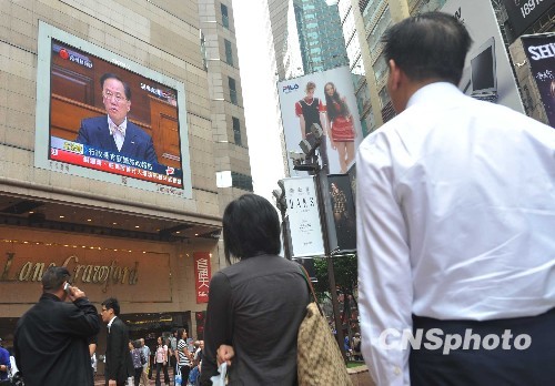 十月十四日,香港特區(qū)行政長官曾蔭權在立法會公布二零零九至一零年施政報告,市民在銅鑼灣時代廣場戶外大型電視屏幕下駐足收看電視直播。 中新社發(fā) 鄧慶樂 攝
