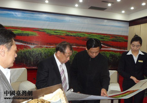 盤錦市市長(zhǎng)贈(zèng)送臺(tái)商具有盤錦地域特色的“天下奇觀紅海灘”蘇繡畫軸留念。(圖片來源:盤錦市臺(tái)辦)