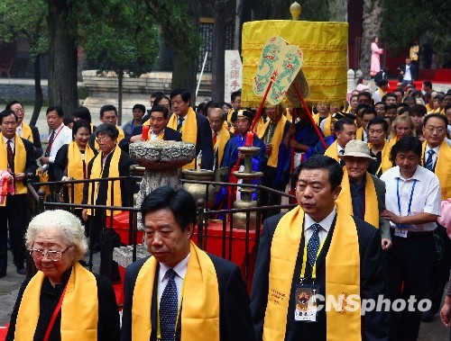 《孔子世家譜》續(xù)修告成頒譜大典儀式,9月24日上午在山東曲阜孔廟舉行!犊鬃邮兰易V》續(xù)修歷經(jīng)十載,其世家譜上下傳承,詳明記載孔子傳裔80多代,300余萬(wàn)人遍及全中國(guó)和海外,以其延時(shí)之長(zhǎng)、族系之明、纂輯之廣、核查之實(shí)、保存之全堪稱存世譜牒之冠。 中新社發(fā) 宋吉河 攝
