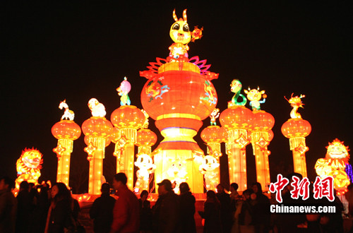29日,“神龍躍兩岸,盛世共和諧”2011江蘇(揚州)燈會在揚州瘦西湖畔宋夾城正式亮燈迎客。圖為揚州燈展區(qū)主燈“玉兔送福,群獅賀歲”,集聲、光、電、控于一體,充分體現(xiàn)低碳理念和揚州燈彩的特色 崔佳明 攝