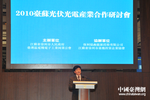 中國臺(tái)灣網(wǎng)12月11日徐州消息 12月8日,“2010臺(tái)蘇光伏光電產(chǎn)業(yè)合作研討會(huì)”在臺(tái)北隆重舉行。徐州市委書記曹新平和中國國民黨副主席、海基會(huì)董事長江丙坤作主旨演講,臺(tái)灣電機(jī)電子工業(yè)同業(yè)公會(huì)理事長焦佑鈞致辭,徐州市委常委、徐州經(jīng)濟(jì)技術(shù)開發(fā)區(qū)管委會(huì)主任秦景安介紹了徐州經(jīng)濟(jì)技術(shù)開發(fā)區(qū)投資環(huán)境,研討會(huì)由徐州市副市長張赴寧主持。