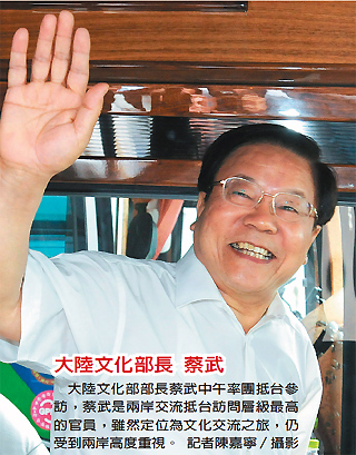 據悉,蔡武一行參加兩岸文化論壇活動后,將赴中南部參訪各項文化建設,預計8日結束訪問離臺。