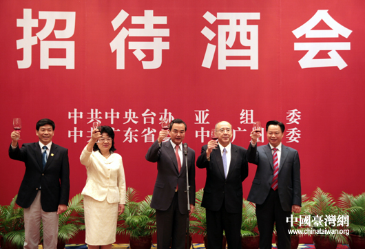 中共中央臺辦主任王毅在酒會致辭中表示,廣州亞運會是亞洲的盛會,也是一次兩岸的盛會。在兩岸關(guān)系取得重大積極進展這一新的歷史背景下,廣州亞運會將成為繼北京奧運會、上海世博會之后兩岸同胞加強聯(lián)系、增進了解、融洽感情的又一重要平臺,相信每一位臺灣同胞在這里都可以感受到友善與熱情,每一位臺灣體育健兒在這里都能夠展示出自己的風采。中共中央臺辦將繼續(xù)與廣州亞組委及其它有關(guān)方面保持密切溝通與配合,切實做好各項接待和服務(wù)工作,為中華臺北體育代表團提供一個公平的競賽環(huán)境,為臺灣各界同胞營造一個溫馨的觀賽氛圍。同時,我相信大陸同胞特別是廣州民眾也一定會伸出雙手,為臺灣的體育健兒鼓勁和加油。