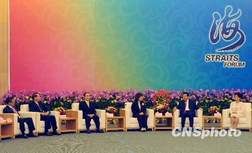 6月19日下午,中共中央政治局常委、全國政協主席賈慶林在廈門會見前來參加第二屆海峽論壇的中國國民黨副主席黃敏惠、新黨主席郁慕明、親民黨秘書長秦金生、無黨團結聯盟主席林炳坤等臺灣嘉賓代表。中新社發劉可耕攝