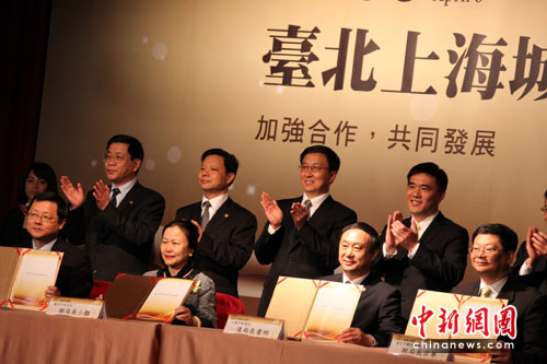 4月6日下午,在首度訪臺的上海市長韓正(后排右2)、臺北市長郝龍斌(后排右1)的見證下,兩市簽署文化、旅游、環保、科技園區交流合作4項備忘錄。中新社發 董會峰 攝