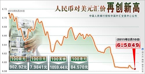 中國外匯交易中心昨日公布,2月10日人民幣對美元匯率中間價報6.5849,較前一交易日微漲1個基點,再次創下了2005年匯改以來的新高。而9日人民幣對美元的中間價則較農歷新年前最后一個交易日走高10個基點。記者統計,2011年以來,人民幣累計升值已達0.57%。