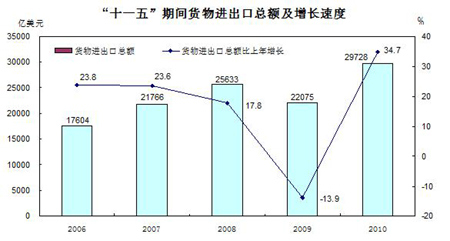 “十一五”期間貨物進(jìn)出口總額及增長(zhǎng)速度 圖片來(lái)源:國(guó)家統(tǒng)計(jì)局網(wǎng)站