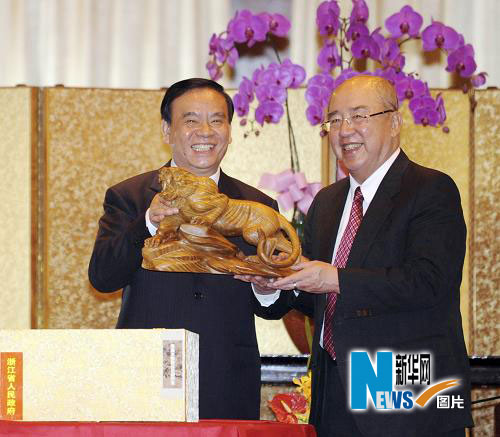 6月9日,中國(guó)國(guó)民黨榮譽(yù)主席吳伯雄(右)在臺(tái)北圓山大飯店與浙江省省長(zhǎng)呂祖善互贈(zèng)禮物。當(dāng)日,浙江省長(zhǎng)呂祖善率領(lǐng)的千人代表團(tuán)抵達(dá)臺(tái)北,開(kāi)始進(jìn)行為期一周的訪問(wèn)。圖片來(lái)源:新華網(wǎng)