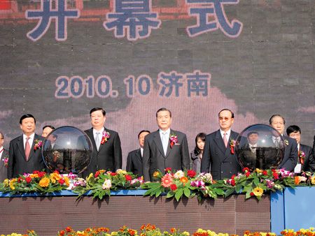 “2010年山東臺灣名品博覽會”昨日在山東濟南展開,山東省委書記姜異康(左二)和臺灣外貿協會董事長王志剛(右三)共同出席開幕典禮。圖片來源:臺灣中國時報