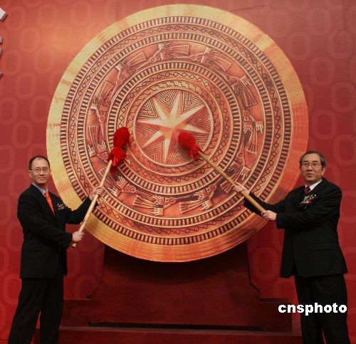 12月5日,臺泥貴港廠舉行竣工慶典,廣西壯族自治區主席馬飚(右)和董事長辜成允(左)共同擊鼓啟動竣工儀式。臺泥貴港廠計劃總投資36億元,目前已完成投資26.35億元,隨著該廠4條日產6000噸水泥熟料生產線的順利竣工,臺泥在大陸市場的規劃產能已突破2400萬噸。 中新社發 林艷華 攝