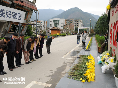 陳芳姿夫婦在省市縣有關(guān)領(lǐng)導(dǎo)陪同下赴綿陽(yáng)市北川老縣城地震遺址參觀祭奠。(四川省臺(tái)辦)