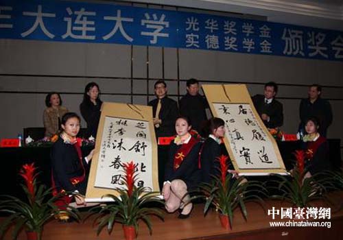 中國(guó)臺(tái)灣網(wǎng)12月15日大連消息 日前,遼寧大連大學(xué)舉行2010年光華獎(jiǎng)學(xué)金、實(shí)德獎(jiǎng)學(xué)金頒獎(jiǎng)大會(huì)。臺(tái)灣光華教育基金會(huì)特別助理賈寧先生、大連實(shí)德集團(tuán)副總裁王德華先生、我校王一波副校長(zhǎng)、李玉光副校長(zhǎng)及獲獎(jiǎng)學(xué)生參加了頒獎(jiǎng)大會(huì)。