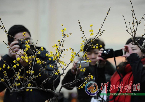 攝影愛好者在保康蠟梅節上拍攝盆景蠟梅(資料圖片)