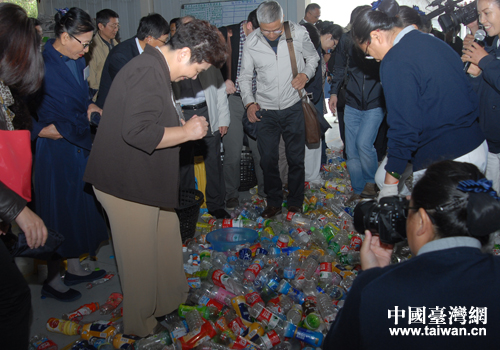 在滬臺籍人大代表政協委員一行體驗踩踏塑料瓶。(圖片來源:上海市臺聯)