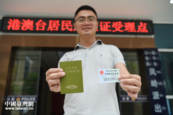 2018年9月1日,南寧市臺(tái)灣同胞投資企業(yè)協(xié)會(huì)會(huì)長周代祥在南寧領(lǐng)到全國第一張臺(tái)灣居民居住證。(圖片來源:廣西臺(tái)辦)