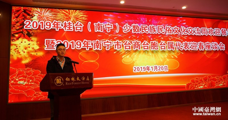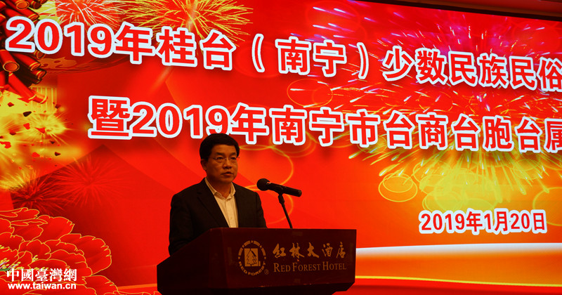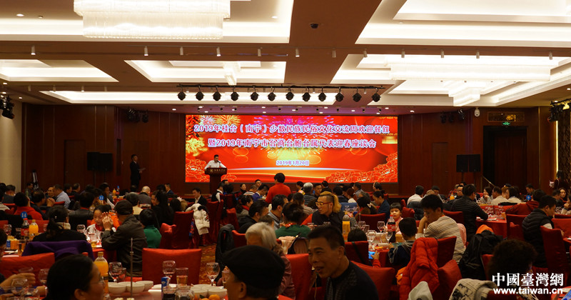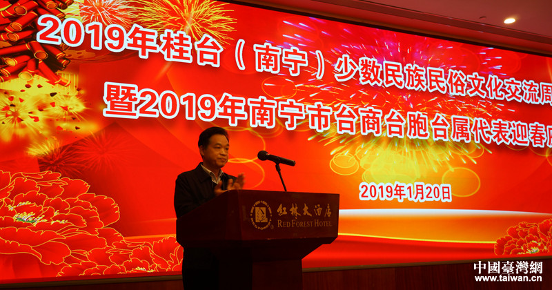 中國(guó)臺(tái)灣網(wǎng)1月29日南寧訊 1月20日,廣西南寧市舉辦臺(tái)商臺(tái)屬代表迎春座談會(huì),南寧市14個(gè)相關(guān)部門與南寧市臺(tái)商臺(tái)胞臺(tái)屬代表,與參加2019年桂臺(tái)(南寧)少數(shù)民族民俗文化交流周的臺(tái)灣嘉賓歡聚一堂,共敘同胞友誼,共話親情友情。廣西臺(tái)辦副主任李文,南寧市委常委、統(tǒng)戰(zhàn)部長(zhǎng)趙紅明出席并致辭。