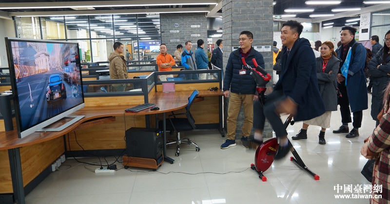 臺灣嘉賓體驗(yàn)“GAME-BIKE智能健身”系統(tǒng)。(圖片來源:廣西南寧市臺辦)