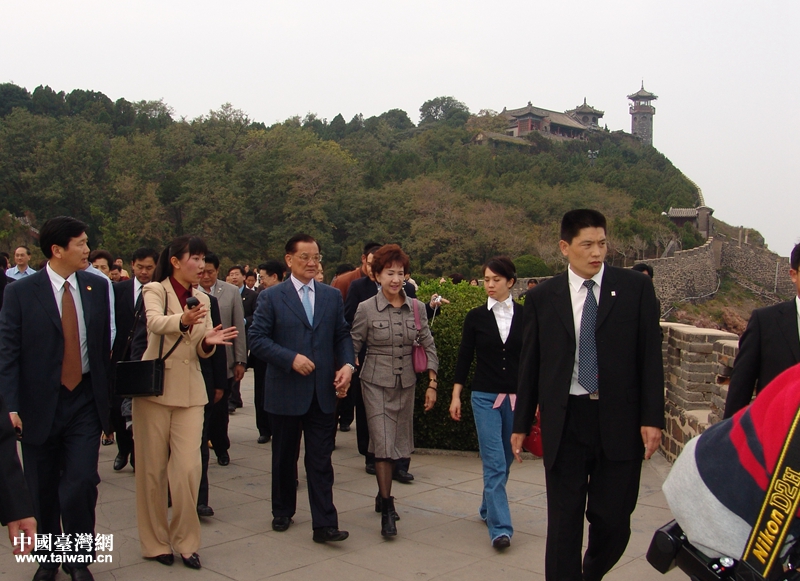 2005年10月,中國國民黨榮譽主席連戰偕夫人參觀蓬萊閣景區。(圖片來源:煙臺市臺港澳辦)