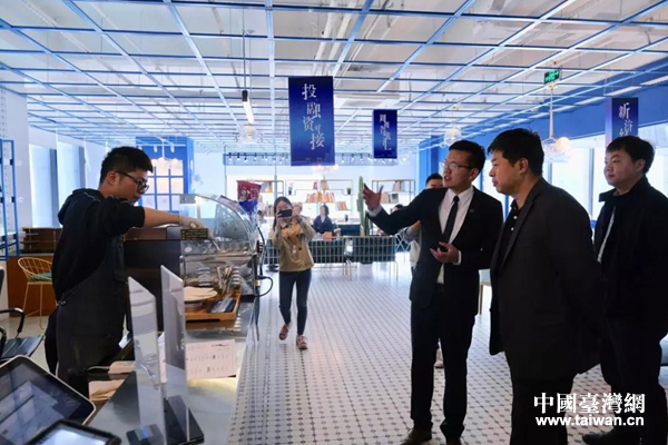 國(guó)臺(tái)辦經(jīng)濟(jì)局副局長(zhǎng)袁野(右二)在華燦工場(chǎng)了解“墻”咖啡理念。(圖片來(lái)源:四川省臺(tái)辦)