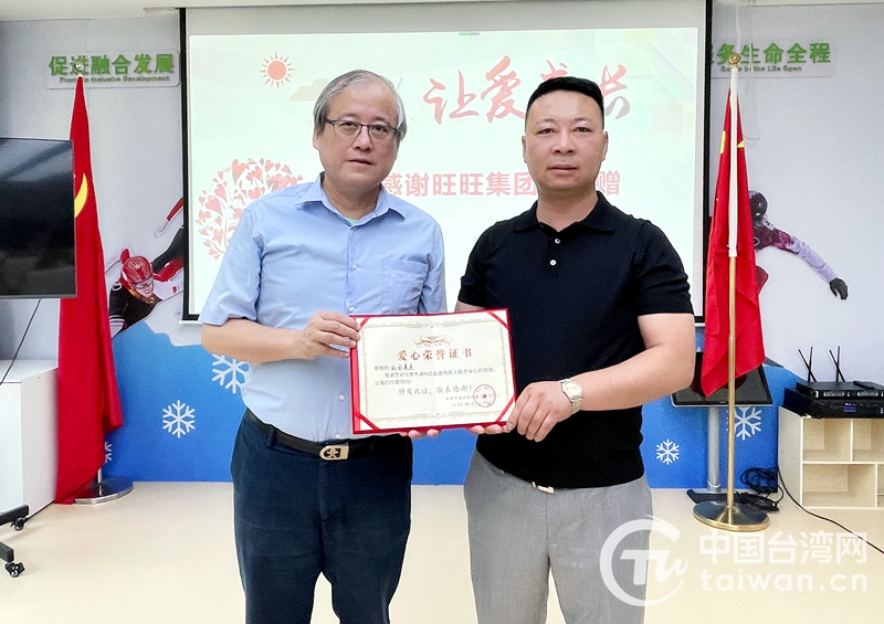 通州啟渡殘疾人服務中心創(chuàng)辦人郭文龍(左)向旺旺集團北京首席代表、全國臺企聯(lián)常務副會長林天良頒發(fā)《愛心榮譽證書》。(中國臺灣網(wǎng)發(fā))
