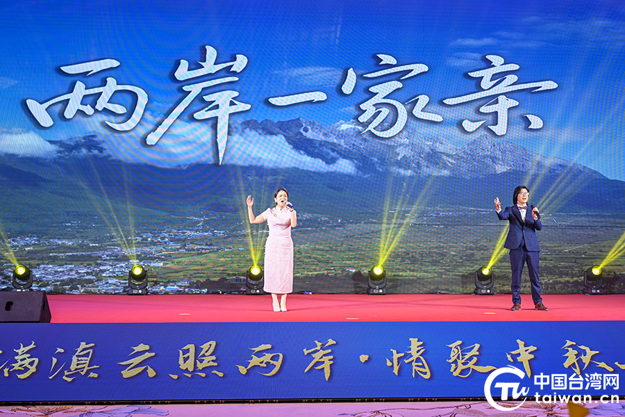 臺胞游純瑜與麗江教師謝學飛夫妻在2025云臺中秋茶話會現場演唱《兩岸一家親》歌曲(中國臺灣網發)