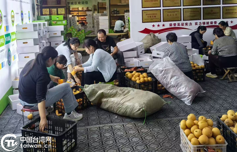 臺胞志愿者們與農(nóng)人們共同分裝滯銷的秋月梨。(中國臺灣網(wǎng)發(fā))