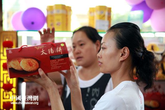 9月17日,“臺中縣農特產品瑞和泰直銷專柜”在江蘇常州市開業,圖為常州市民在專柜區選購農特產品太陽餅。(中國臺灣網 鐘寶華 攝)