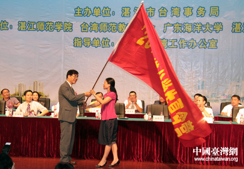 湛江市委常委、宣傳部長(zhǎng)盧瑜(右)向夏令營(yíng)總領(lǐng)隊(duì)授旗。(圖片來源:湛江臺(tái)辦)
