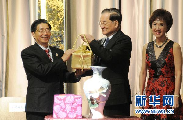 7月1日,中國國民黨榮譽主席連戰(中)向郭聲琨贈送禮物。當日,率團訪問臺灣的中共廣西壯族自治區委書記郭聲琨在臺北拜會了國民黨榮譽主席連戰。 新華社記者 向志強 攝