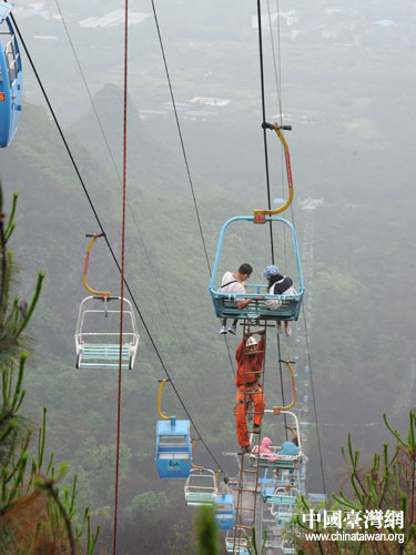 中國臺灣網6月1日桂林消息 5月26日,廣西桂林,大雨低溫。當天上午,桂林堯山觀光纜車因機械故障停止運行,78名游客被困1400米段長的高空纜車,其中有22名臺灣游客。