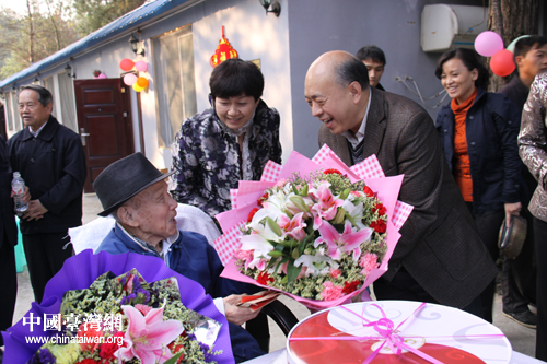 中國臺灣網11月2日貴陽消息 10月31日下午,貴陽墨石山莊養老院張燈結彩,擺起豐盛的長桌宴,為居住在養老院的臺胞楊占鰲先生慶賀百歲壽辰。貴州省臺辦聯絡處處長成高榮,貴陽市委統戰部副部長、市臺辦主任李靜,副主任劉筑琪,白云區副區長李蕓及區臺辦、民政局、都拉鄉等當地相關部門負責人均前往祝賀。