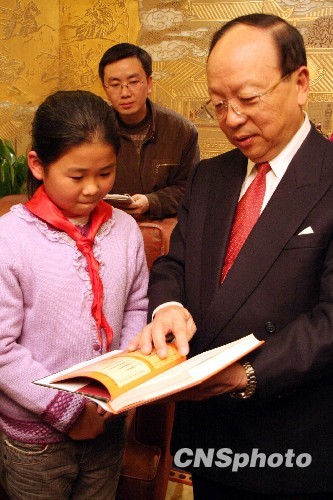 今年夏天,莫拉克臺風(fēng)重創(chuàng)臺灣南部,大陸各界踴躍捐款捐物,其中最令人感動的,是一封來自西安小學(xué)生的親筆信和隨信附上的二十元人民幣小額捐款。中國國民黨副主席蔣孝嚴(yán)十九日在西安出席海峽兩岸(陜西)經(jīng)貿(mào)科技合作大會后,特意約見了這位感動了無數(shù)臺灣人的十一歲女孩楊卓西。圖為蔣孝嚴(yán)向楊卓西贈書。 中新社發(fā) 冽瑋 攝