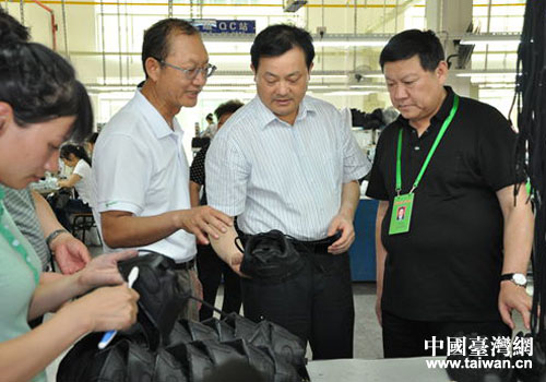 永州市委黨委、市委副市長易佳良(中),寧遠縣委書記嚴興德(右)在寧遠臺資企業華榮鞋業總經理曾文鋒(左、臺胞)陪同下參觀生產車間。(圖片來源:永州市臺辦)