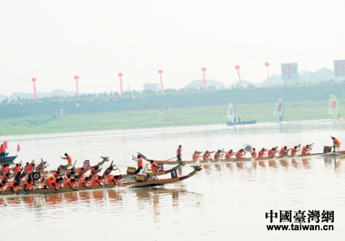 海峽兩岸12支龍舟隊同場競技,紀念先賢屈原,歡度端午佳節。(圖片來源:岳陽市臺辦)