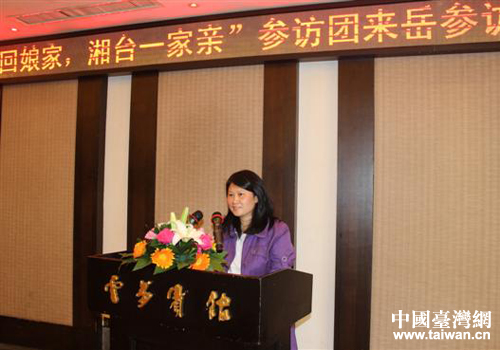 中國臺灣網10月21日岳陽消息 10月15日至20日,由湖南省委臺灣工作辦公室主辦、岳陽市委臺灣工作辦公室承辦、臺灣湖南文獻社協辦的2013“歡喜回娘家、湘臺一家親”岳陽行參訪活動在岳陽舉行。由臺灣湖南文獻社社長、岳陽籍“大陸新娘”黃國暉女士率領的40名在臺陸配歡聚岳陽,共敘鄉情友情。