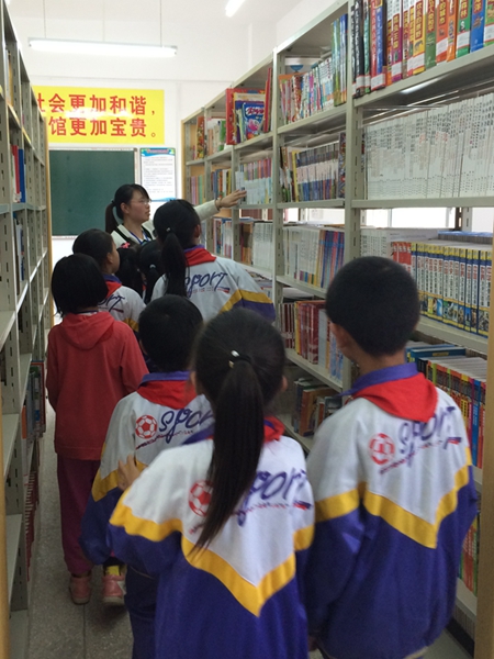 鵝公鎮(zhèn)中心小學(xué)的學(xué)生在老師帶領(lǐng)下進(jìn)入圖書室借書