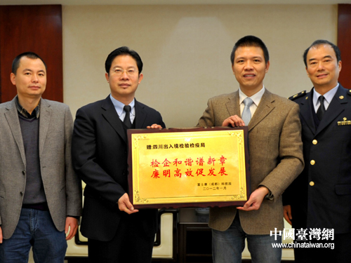成都富士康公司向四川檢驗(yàn)檢疫局贈(zèng)送牌匾。(圖片來(lái)源:四川省臺(tái)辦)