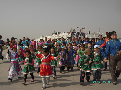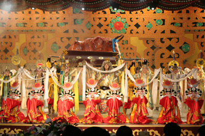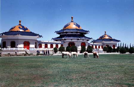 成吉思汗行宮位于陵園東南角約l公里處。由直徑18米、高13米的金頂大帳、側(cè)殿、高8米的選汗臺(tái)、射獵場、賽馬場、3輛車輪高2米的巨大戰(zhàn)車等組成。在這里,游人既可欣賞蒙古民族的歷史文化,又可領(lǐng)略草原風(fēng)情。