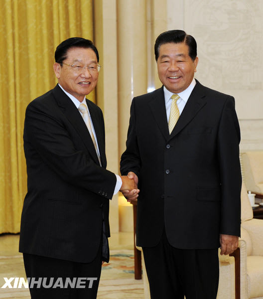 10月28日,中共中央政治局常委、全國政協主席賈慶林在北京人民大會堂會見臺灣海基會董事長江丙坤率領的海基會新聞交流團一行。新華社記者 饒愛民 攝