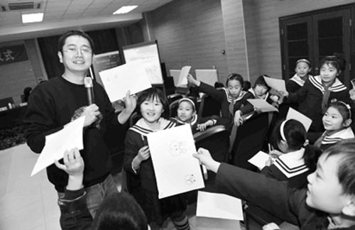 圖為漫畫家胖兔子粥粥與北京芳草地國際學(xué)校的小學(xué)生一起展示剛完成的漫畫。