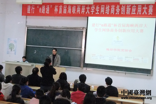 3月26日下午,首屆海峽兩岸大學(xué)生網(wǎng)絡(luò)商務(wù)創(chuàng)新應(yīng)用大賽暨第四屆大陸大學(xué)生網(wǎng)絡(luò)商務(wù)創(chuàng)新應(yīng)用大賽在濰坊學(xué)院舉行入校宣講會(huì)。(圖片來源:濰坊學(xué)院)