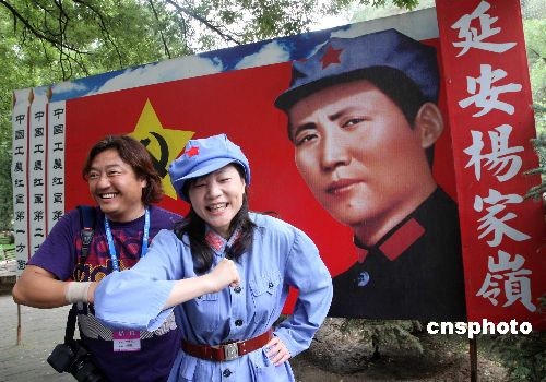 7月20日,參加“情系長(zhǎng)安——兩岸文化聯(lián)誼行”的臺(tái)灣嘉賓劉盈希(右),在參觀延安楊家?guī)X革命舊址時(shí),饒有興致地穿上當(dāng)年紅軍的服裝擺普士(pose)拍照留念。 中新社發(fā) 張宇 攝