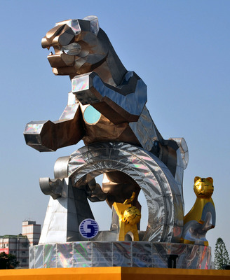 中新網(wǎng)2月24日電 據(jù)“中央社”報(bào)道,2010臺(tái)灣燈會(huì)主燈“福臨寶島”23日完成。亮灰色大虎加上2組金色Q版幼虎燈,不僅姿態(tài)宏偉,兼具歡樂溫馨氣氛,整體造型宏偉富巧思。